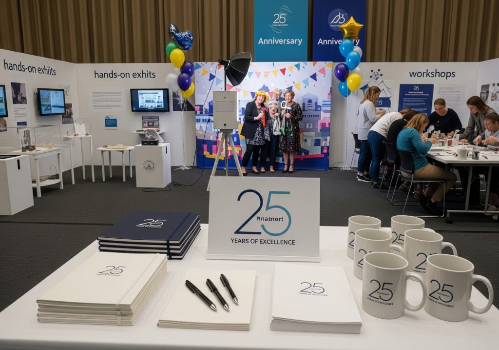 ・記念品:周年ロゴ入りの高品質アイテム(文房具、マグカップ、限定グッズ)